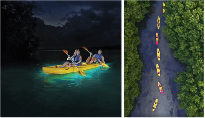 An adventure not to be missed while in Puerto Rico! Join this fully guided night trip into one of the most amazing natural phenomena of the world! Paddle your way through the mystical mangrove channels leading to “Laguna Grande.” There, you will meet our glowing friends, the Pyrodinium Bahamense, a microscopic plankton capable of producing natural light at the touch of your hand! Explore these amazing organisms up close as our professional eco guides take you to discover all its secrets. Learn how this fragile and unique ecosystem maintains a perfect balance of life, and what you can do to protect such a special place. Our 2-hour bio bay kayak tour includes interesting interpretations about the reserve fragile ecology, star constellations, and a fascinating encounter with billions of bioluminescent organisms. The adventure to Laguna Grande can only be described as magical, creating memories that will last a lifetime!