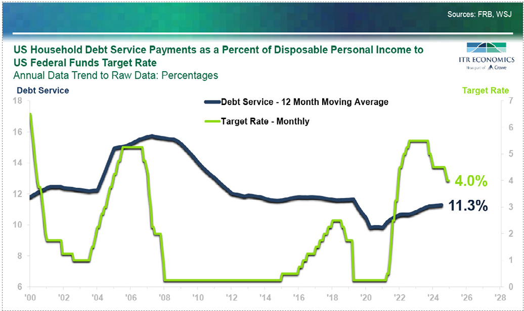It is important to factor in fluctuations in borrowing costs. While rising incomes have helped offset higher debt levels, it is worth considering how much strain elevated interest rates have placed on household balance sheets in recent years. The answer: not as much as you might think. The high-level metric of US Household Debt Service Payments as a Percent of Disposable Personal Income, coming in at 11.3%, is trending below preCOVID levels despite interest rates being higher.