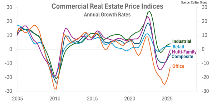 The prior jump in interest rates and soft economic activity last year are weighing on new commercial construction, pulling it down double-digit percentages below year-ago levels. But how is the existing commercial real estate market holding up? CoStar’s US Composite Commercial Real Estate Price Index declined 16.7% from late 2022 into mid-2025 on an annual average basis, but Prices are now in a recovery trend. Office Prices, down 43.4% from a mid-2022 peak, are dragging down the whole. Remote work, the expansion of AI, and weak white-collar employment have made the expense of an office building less appealing. This is a structural problem that is likely to persist. Annual average Multi-Family Prices are beginning to rebound and are just shy of year-ago levels. Meanwhile, Retail Prices and Industrial Prices are above year-ago levels and accelerating as they rise.