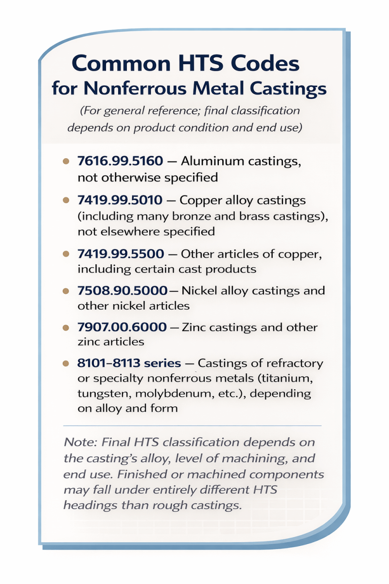 For nonferrous foundries, most raw castings fall under HTS Chapter 76 for aluminum or Chapter 74 for copper-based products. A common example is HTS 7616.99.5160, which covers many types of aluminum castings not specified elsewhere.